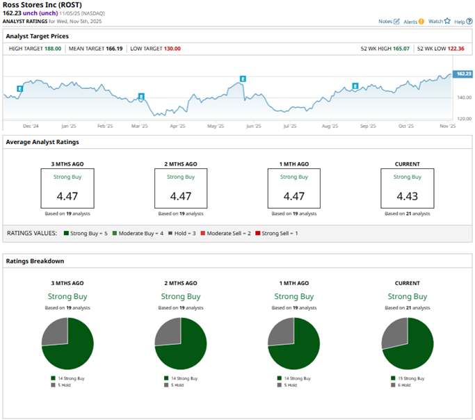 On Nov. 5, UBS analyst Jay Sole reaffirmed a “Neutral” rating on Ross Stores’s stock, while raising the price target from $147 to $163, reflecting improving confidence. Last month, Wells Fargo analyst Ike Boruchow kept an “Overweight” rating, while raising the price target from $175 to $180.