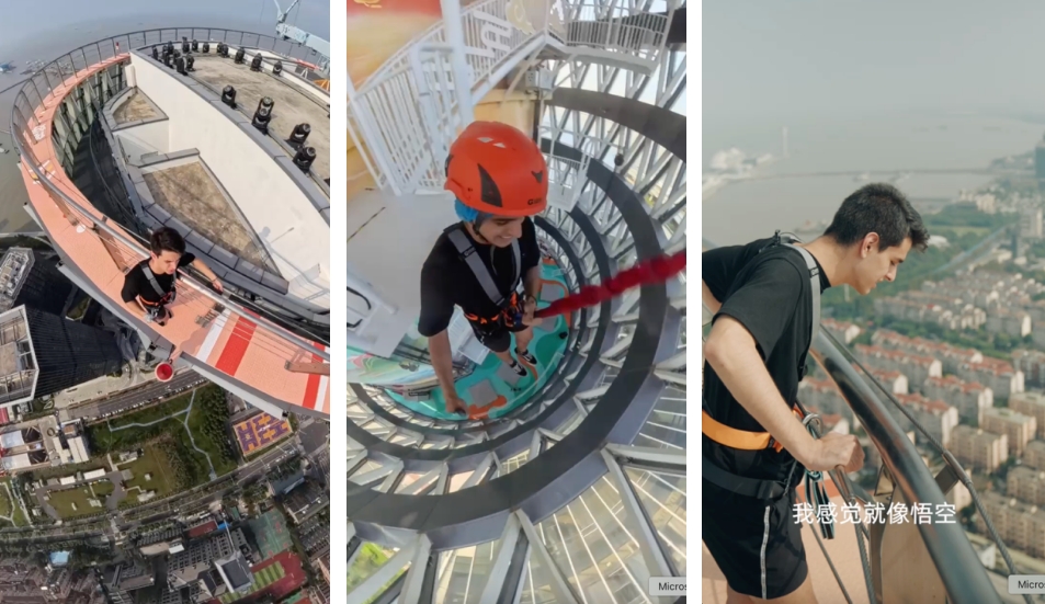 Where can one find the “Golden Cudgel” taken from the sea? Growing larger and larger, it now stands tall by the riverside, swaying in the wind. Located at the confluence of the Yangtze and Huangpu Rivers, the monumental “Golden Cudgel” sculpture overlooks Shanghai Wusongkou International Cruise Terminal and the Baoshan Port Area, offering panoramic views of the waterfront and urban skyline — a landmark for ships passing north and south. Boldly standing atop the “staff’s head,” Mark experienced a “cloud walk” without the “somersault cloud,” then took a daring leap to enjoy the thrill of “speed crossing” within the golden pillar.